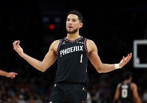 布克在40分钟的时间里,投篮19中6,三分球5中1,罚球11中11,拿下24分9篮板9助攻1抢断的数据,有4次失误。